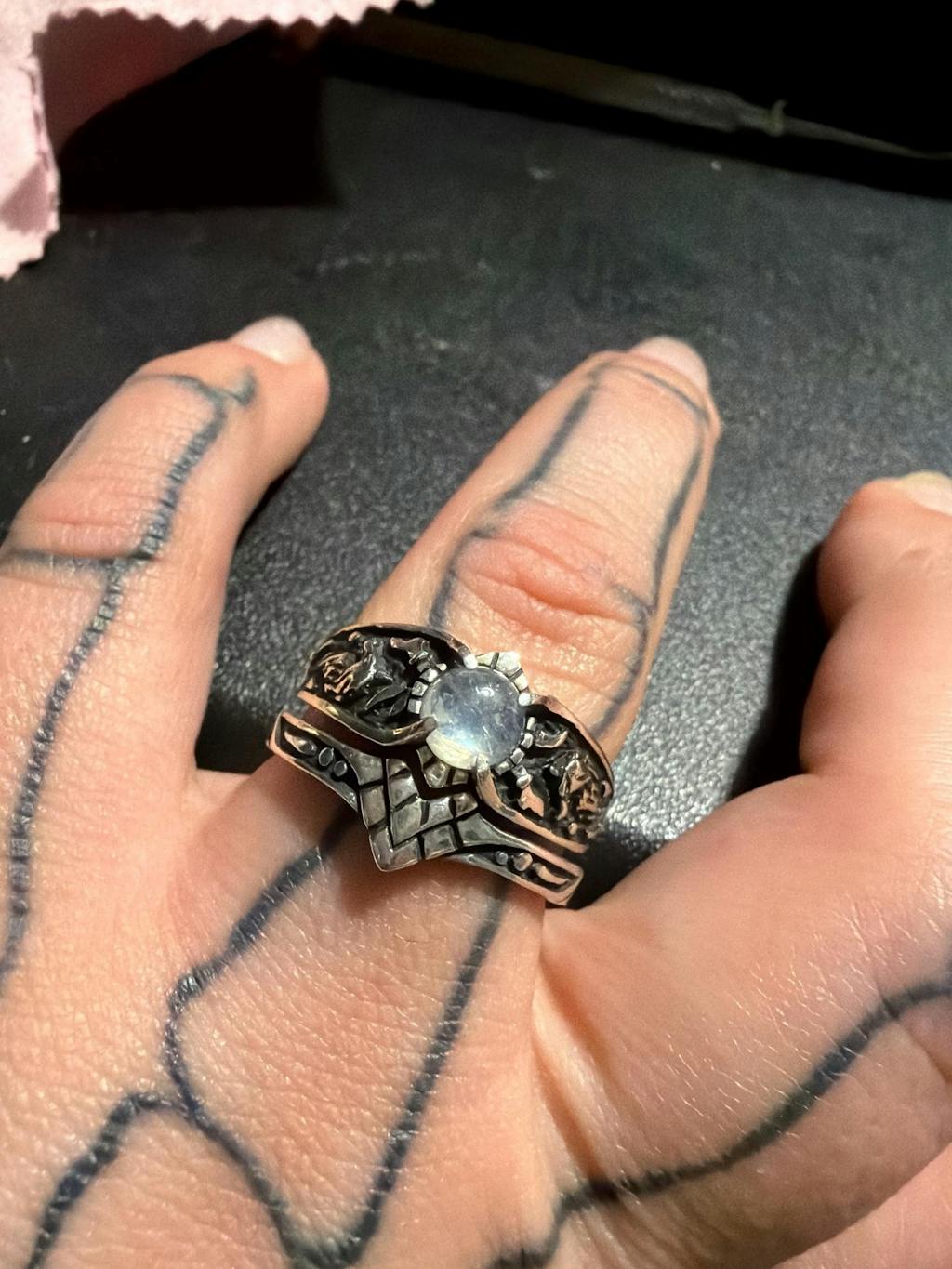 Absolutely gorgeous rings! Even my husband who doesn’t like jewelry is happy to wear his. The size is perfect for mine, my husbands is a bit big but we didn’t know his ring size and guessed, we were about half a size off and it’s easy to get a sizer to put in it so no big deal. The moonstone is gorgeous, the wolves are amazing, they are real silver as far as I can tell, they’re exactly as described. the rings are all together just perfect.