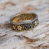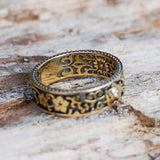Crafted entirely by hand, this wide 14K solid gold wedding band is a true piece of artisan jewelry. Designed to be unisex, it features intricate floral engravings along the entire band, both outside and inside, inspired by nature’s beauty. The antique effect is created using black rhodium plating, giving the piece a bold, vintage appearance while enhancing every engraved detail.