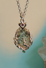 Inside this pendant lives a beautiful world - a dendritic agate whose natural patterns form a tiny forest shaped entirely by nature. In front of this landscape rests a miniature hare in solid 14K rose gold, its outline carved with precise, delicate detail. The scene feels like a moment caught mid-story: the hare pausing, the forest listening.