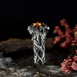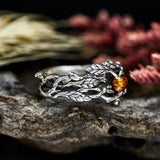 Seductive from its nature, the "Audrey" ring offers Amber of warm colors and Sterling Silver band with intricate design. This ring delights with the detailed leaves and twigs which are intertwined along the band and hold a Natural Amber in the center of the ring.