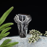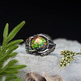 The Phoenix Ring channels strength, rebirth, and inner fire. Sculpted in sterling silver with a vintage oxidized finish, this large statement ring features a rare natural Ammolite gemstone with shifting rainbow hues that echo the mythical Phoenix’s rise from ashes.