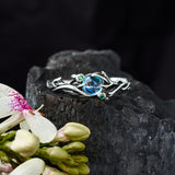 The "Laguna" ring reflects the serenity of nature through its delicate floral design and luminous gemstones. At its center glows a vivid natural Blue Topaz, echoing calm skies and inner clarity. Two natural Tsavorites shimmer beside it - gentle green sparks nestled among detailed petals and leaves.