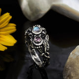 Blacktree's exquisitely crafted sterling silver labradorite ring is the perfect choice for an engagement ring with significance. The sun and moon symbols—each other's eternal companions—are featured on both sides of this beauty with floral motifs. The summery vibe of “Galaxy”, a multi stone ring with labradorite and pink tourmaline, will not leave anyone indifferent. For October birthdays, “Galaxy” can be given as a gift with their birthstone—tourmaline.