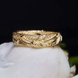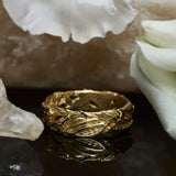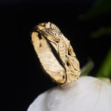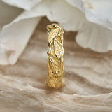 Discover "Amadeo" - a bold nature-inspired men’s ring crafted from solid 14K gold. With its wide band and earthy leaf engravings, this bohemian ring brings a grounded character to your collection. The detailed texture, combined with the warm glow of gold, makes it an ideal gold wedding band, engagement ring, or promise ring for him.