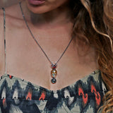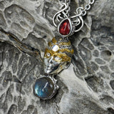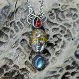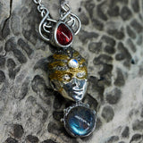 "Perseida" is a handmade Sacral Pendant made in the name of the Goddess by hands in Sterling Silver and using Natural gemstones - Labradorite, Moonstone and Tourmaline. There's a 14K Gold plating on some elements of the pendant. Combining the power and colors of 3 Natural gemstones with the Silver and Gold Plating, this pendant is a unique piece of Sacral jewelry worth to wear it for any reason.