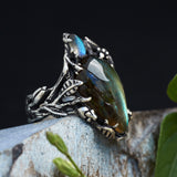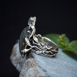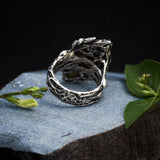 Looking for a ring to attract people's attention around and receive applauses? Have a look at "Lucia". It's absolutely handcrafted out of Sterling Silver, and has a unique floral design - intertwined leaves, flowers and twigs together hold one large pear-shaped Labradorite and the other one smaller, of a marquise shape. This ring is for true nature lovers, everything is made harmonically, the design and the gemstone choice.