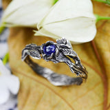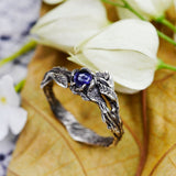 A delicate ode to nature, Florence captures the spirit of a wild garden. Handcrafted from 925 sterling silver, this proposal ring features a luminous natural Iolite embraced by finely sculpted leaves and tiny blossoms. The oxidized finish brings depth to every petal and curve, revealing a richness in detail.