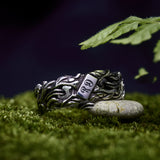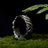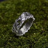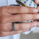 Here's the ring you've been waiting for--a sterling silver men's band with an engraving pad! You can have a secret message, reminder, or direction engraved on this personalized mens wedding band for your beloved. This is a very personal and meaningful gift, which will remind the recipient of important things all his life and protect him from harm. A wide viking ring with an exquisite design of twigs and vines is subtle, but catches the eye and will stylishly complement any image.