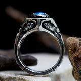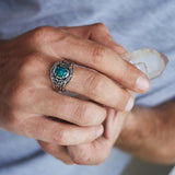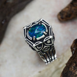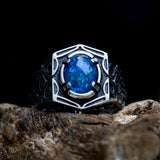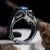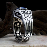 This mens Opal ring is a gorgeous gift for the person you love because it is full of powerful pagan symbols. In this blue stone ring, a shaman is depicted playing a flute to sacred plants. The leaves of another sacred plant – sage – are inside of this spiritual anniversary ring. The ring "Shamania" is topped with serpents that symbolize wisdom, guiding the wearer on their journey. This sterling silver ring symbolizes the unity of dark and light, the union of opposites. When we don't see everything in terms of black and white, the sun and moon can shine at the same time. This masculine ring is quite wide and pleasantly heavy, making it a real favorite.