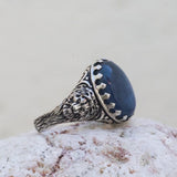 “Majesty” is a splendid men’s statement ring specially handcrafted and designed with oxidized sterling silver. It carries a single Kyanite gemstone that complements the design.