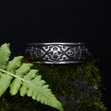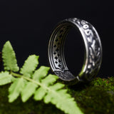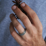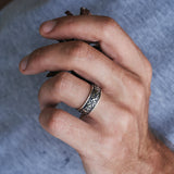 “Dusk” is a blackened silver men's wedding band with a sleek, stylish design inspired by Celtic and Viking legends. The thick silver ring's intricate details are empowered by ancient symbols. This boho ring is a beautiful and personal gift for the man in your life. It can be worn as a promise ring, anniversary band, or engagement ring.