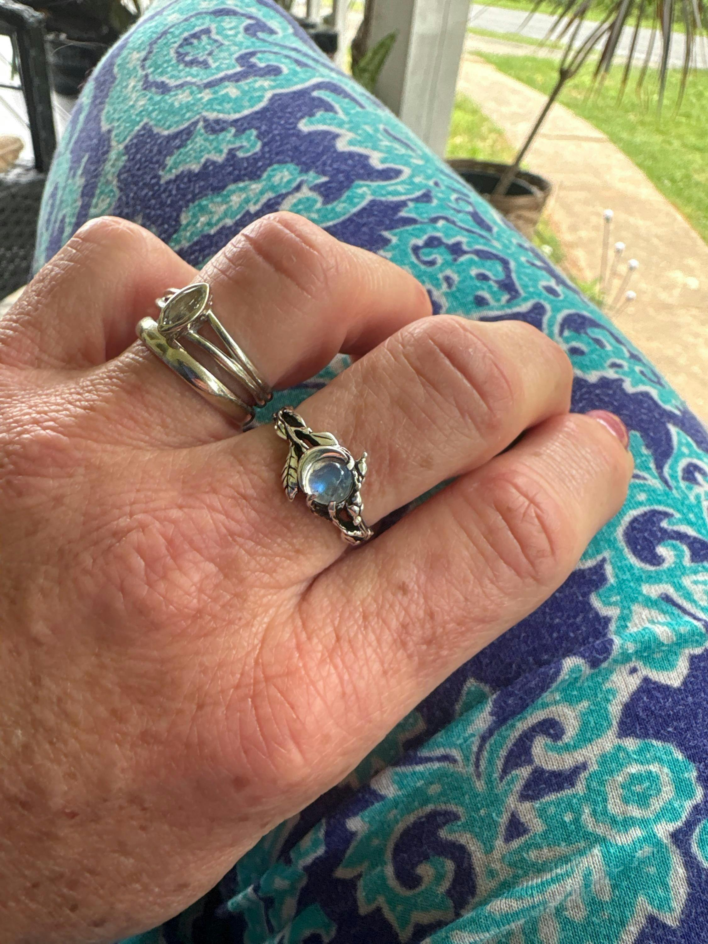 Crafted entirely by hand from solid 925 Sterling Silver, this boho moonstone ring celebrates feminine energy and connection to nature. The luminous natural Moonstone shifts with every angle, reflecting soft flashes of blue and peach - long believed to enhance intuition and emotional clarity.