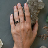 The "Ivy" ring is a stunning nature-inspired ring crafted from blackened Sterling Silver 925, featuring a rich green Moss Agate at its center. Detailed with a graceful leaf and branch design, it reflects the serene beauty of the forest.