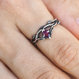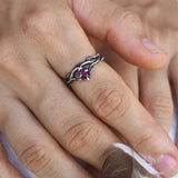 The “Carmen” is a striking pink tourmaline ring crafted in solid Sterling Silver 925, featuring a vivid marquise-cut Rubellite. The contrast of bright silver and deep oxidized black creates a gothic ring look with artistic edge.