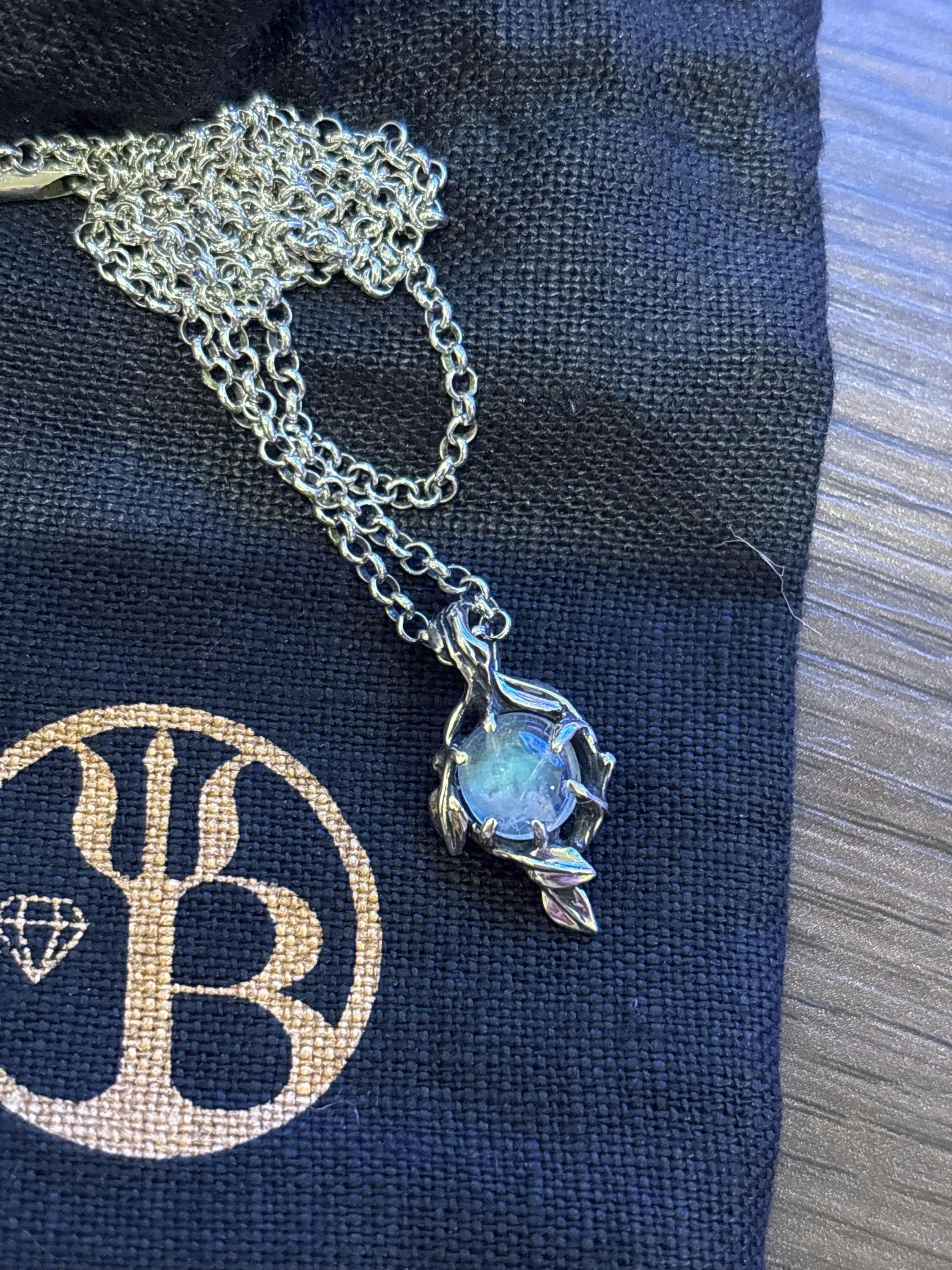 Louise is sized for everyday wear: a 2.4×1.1cm pendant with an 8mm rainbow moonstone framed by oxidized sterling silver leaves and branches. The setting has a wood-grain texture worked into the surface - visible in the leaf veining and along the branch forms that hold the stone.