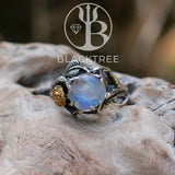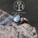 “Cleo” is a splendid Rainbow Moonstone ring handcrafted and designed out of oxidized sterling silver. It carries a rose made from solid 14 Karat gold around its axis that complements the originality of the design.