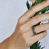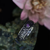 This striking engagement ring design is both classic and modern. Handcrafted from blackened silver 925, “Lilian” features a lovely purple stone, amethyst - a powerful healer for the emotional body, reducing stress and bringing inner peace. Give your sweetheart a gift she'll treasure for years—this bohemian style ring.