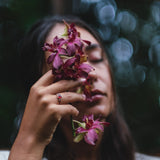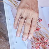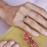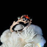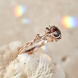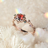 Remind the warmest memories of your life together with the floral motifs in the "Glory" ring! Treat a Garnet as a source of joy, while Tsavorits as sparkling according in this sensual composition. 14K Rose Gold provides enlightenment and detailed handmade work completes the high value of this bohemian adornment.