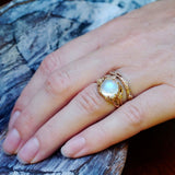 Made from solid 14K gold - available in rose, yellow, or white gold - each ring reflects artisanal skill and quiet elegance. The moonstone, known for its ethereal glow and connection to feminine energy, makes this ring set an ideal choice for a moonstone engagement or bridal ring set with symbolic depth.