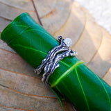 The band gently curves to nestle the engagement ring, forming a graceful silhouette that speaks of quiet connection and harmony. Oxidized antique finishing highlights every leaf-like texture and natural contour, giving the set a sense of depth and story.