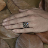 A union of texture and meaning – this handcrafted stacking ring set pairs the luminous “Dew” Moonstone ring with the botanical elegance of the “Mio” band. Both rings are made from solid 925 Sterling Silver with oxidized finishing, reflecting a deep connection to the organic world.