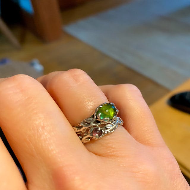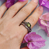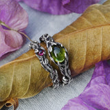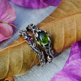 Handcrafted from solid 925 sterling silver, this organic wedding ring set pairs two natural gemstones – a soft green chrysolite (peridot) in the engagement ring and a pink tourmaline in the matching curved band.