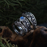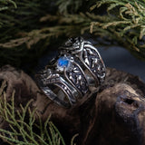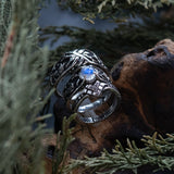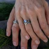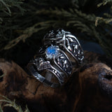 Each piece is made from solid 925 sterling silver and finished with oxidized detailing that highlights its organic textures. The women’s engagement ring features a natural rainbow moonstone, glowing with ethereal light. Wolves engraved on each band honor the idea of lifelong devotion and unity, making this an ideal set for couples who value meaning in their jewelry.