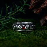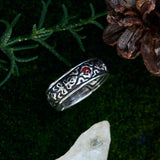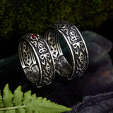 The women’s ring is adorned with a natural ruby, long known as a stone of royalty and inner fire. Encased in blackened sterling silver and surrounded by ancient symbols, it radiates quiet power and timeless love.