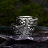 The men’s band features a wide, bold design with gothic ornament, forged in oxidized sterling silver for a moody, elemental look.