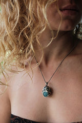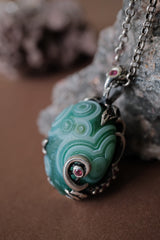 Sign is a one-of-a-kind Gobi Agate pendant, built around a rare, rich green, semi-translucent stone with an organic, egg-shaped form.
