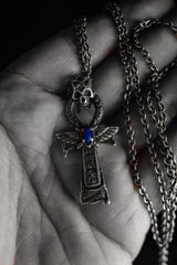 The "Ankhon" skull pendant brings ancient Egyptian wisdom to life. Crafted from 925 sterling silver with a blackened finish, this gothic pendant features a powerful combination of symbolism: the skull for mortality, the scarab for rebirth, and the "Ankh" for spiritual balance. Adorned with a deep blue lapis lazuli gemstone, this Ankh pendant represents the eternal cycle of life and death.