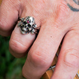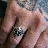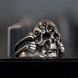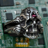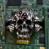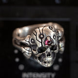 In a world marked by desolation, this skull-adorned ring symbolizes a cyborg's rebellion for love and humanity's values. Its weighty design, featuring a carefully selected garnet, echoes a simple yet profound truth: love can redeem the world.