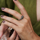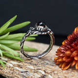 This gemstone is nestled in a Sterling Silver band, handcrafted with organic branch textures and adorned with detailed leaf motifs. The oxidized antique finish highlights every delicate curve and gives this ring a timeless, gothic-inspired character.