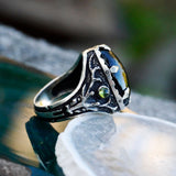 Dark, but with green flashes, Natural Obsidian is placed in the center of the ring. It's considered to be a strong protective stone, which fights with negativity and reduces mental stress.