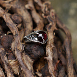 At the center sits a natural Garnet, glowing with deep bordeaux tones. Known for its grounding energy and connection to love, this gemstone brings warmth to the strong geometry of the design.