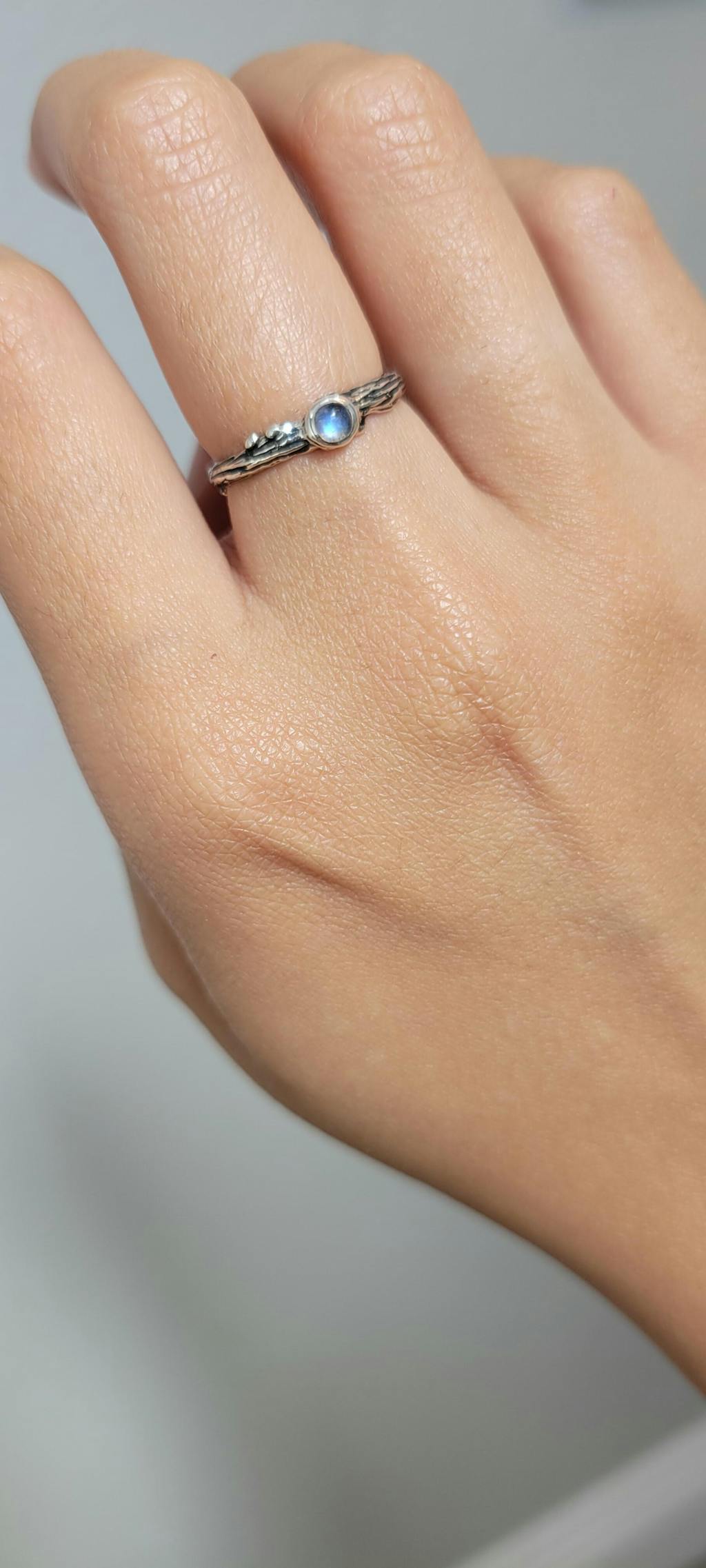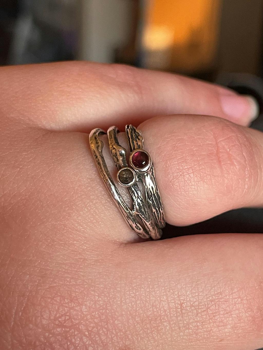 “Dew” is a sterling silver ring that combines perfection and style in a stellar arrangement of jewels with a tiny garnet and a tree branch texture in a nature inspired theme. It is an excellent gift choice for either an engagement ring or a wedding ring.