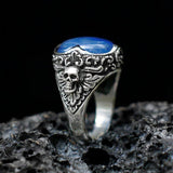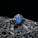 “Elysium” ring was made out of sterling silver and carries a natural Kyanite in its center. Designed in a skull inspired theme, Elysium was finished using the fine oxidation technique. Nothing helps emotional health louder than a Kyanite, and that is what “Elysium” proclaims with the gemstone glistening over the surface.