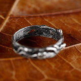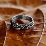 This wedding band was recreated in the style of our original "Mio" wedding band for women, but now with more focus and intentionality specifically for men. This men’s wedding band was made out of 925 sterling silver and was designed as an alternative experience for traditional wedding bands. It is shaped like a branch with outlying leaves and buds. This wedding band was completed using the oxidation finishing technique giving it an authentic antique look.