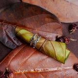 “Dew” is a garnet ring that draws on the natural powers of the garnet such as its ability to restore the body to a revitalized and reenergized state after eliminating toxins while helping the spirit and mind function in a state of emotional balance. Garnets also bring order and alignment to the thought life. On the other hand, “Mio” is a beautiful thin twig ring that exemplifies the best of the BlackTreeLab.