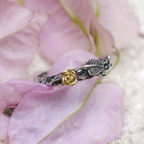 “Angel” is a sterling silver twig ring handcrafted from fine silver with gold plated accents. This piece is a delicate and tender wedding band designed by our master craftsman to represent the beauty of nature around. Its antique look was achieved using oxidation finishing for the silver and gives it a dated look that is certain to get you second looks.
