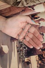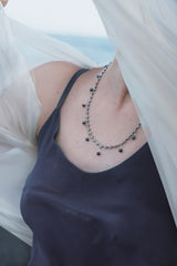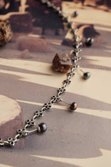 Along the length, round cultured black pearls from Bali - in natural shades from graphite grey to deep violet - are suspended on fine silver bars. These pearls are slowly formed layer by layer in warm island waters, and carefully selected for their luster, depth, and individuality.