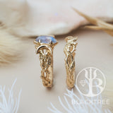 Each element is sculpted by hand - from the flowing vine and branch motifs to the balanced form that allows both rings to be worn together or separately. The soft glow of the moonstone, paired with the warmth of gold, creates a piece that feels deeply personal.