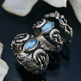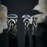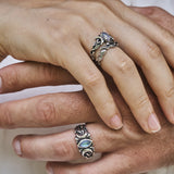 The men’s band mirrors the organic style with vines and branch-like textures carved into oxidized sterling silver, and now includes a natural Moonstone set into its center - a powerful reflection of the one worn by their partner.