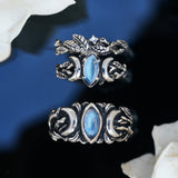 The women's engagement ring showcases a marquise-cut Rainbow Moonstone framed by the Triple Moon symbol - representing the waxing, full, and waning phases of the moon. Its matching wedding band curves gently around it, with finely sculpted leaves and a single star.