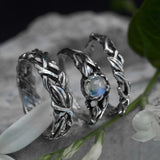 At the heart of the set lies a luminous rainbow moonstone, reflecting a soft iridescence that adds subtle magic to the organic design. The matching women’s wedding band curves naturally around the engagement ring, while the men’s band echoes the same botanical motifs with a bold yet understated presence.