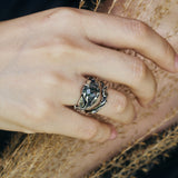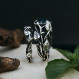 At its center lies a rose-cut moss agate, with delicate green inclusions that resemble drifting gardens or forest mist. The stone is held in oxidized sterling silver, surrounded by sculpted leaves and vines - a band that feels both ancient and alive.